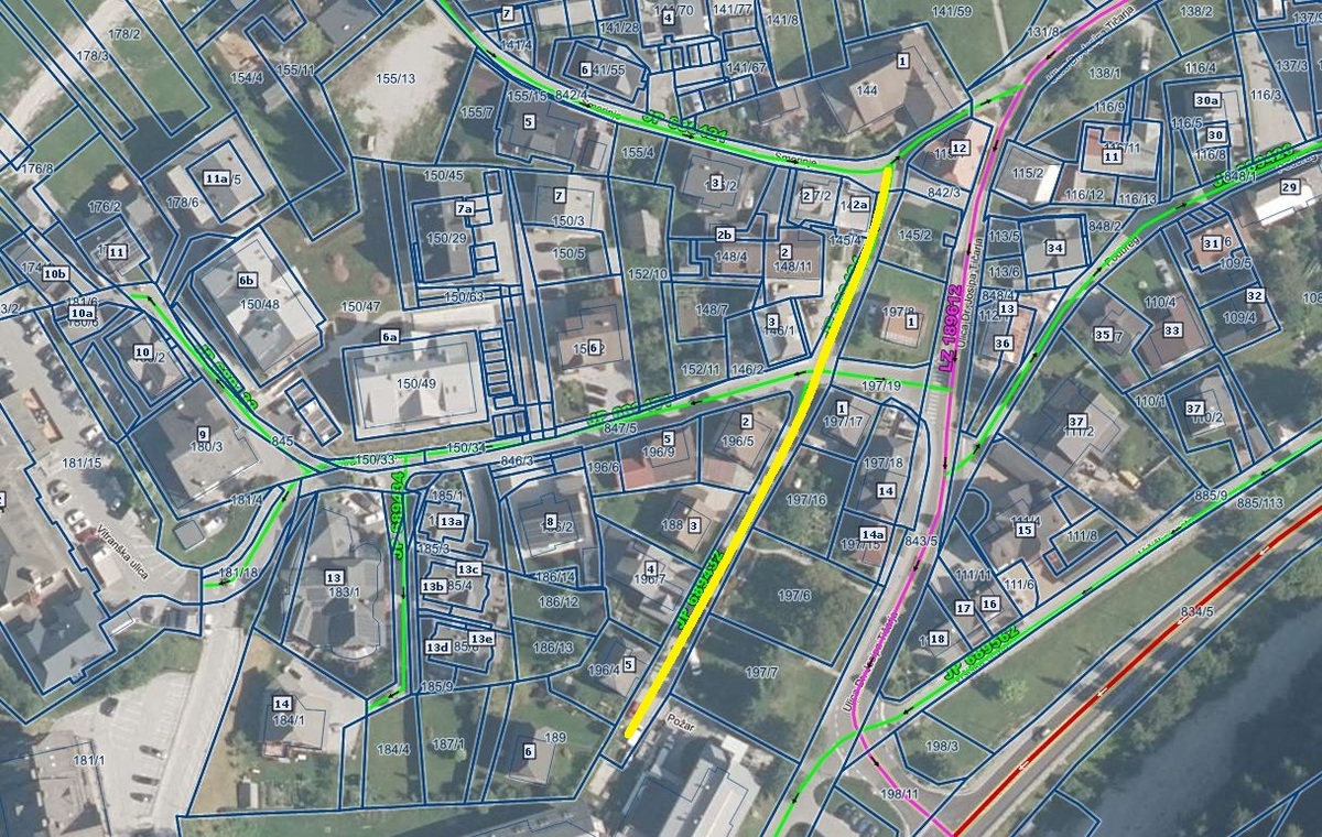 Obveščamo vas o pričetku obnovitvenih del občinske javne poti št. JP 689432 Ulica Požar in javne poti št. JP 689424 ulica Smerinje (od Vitranške ulice 3 do objekta Smerinje 2) v Kranjski Gori, kot je označeno na sliki z rumeno barvo.
